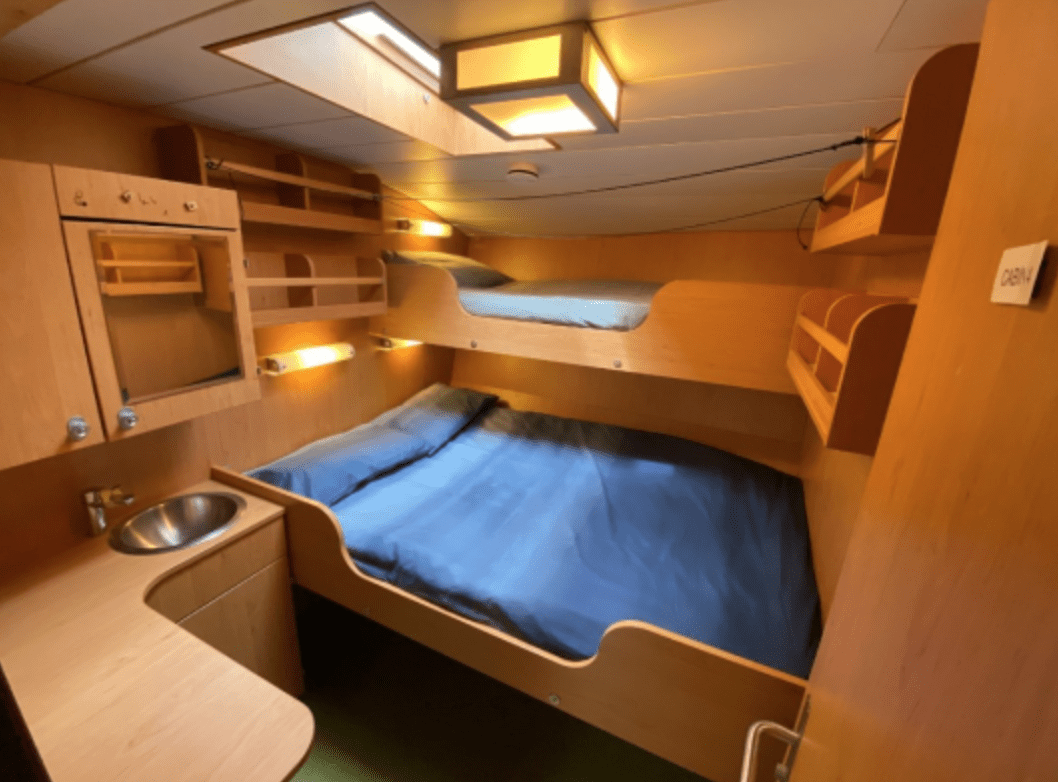 Life onboard is comfortable and welcoming. Guests stay in heated twin-share cabins with upper and lower berths, or in select triple cabins. Three shared bathrooms — each equipped with a shower, sink, and toilet — ensure convenience while maintaining the vessel’s expedition character.
