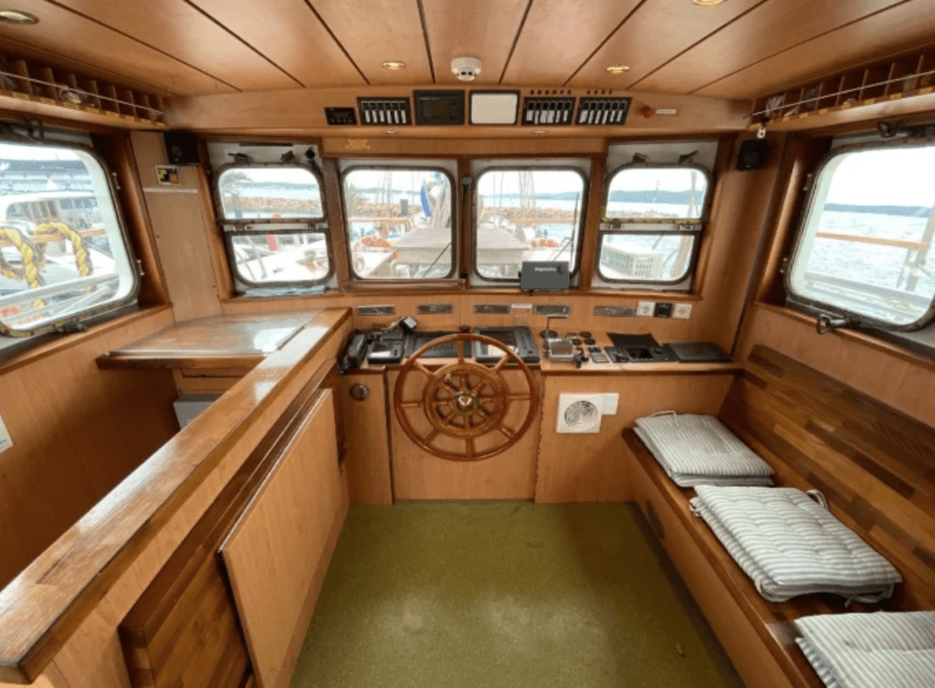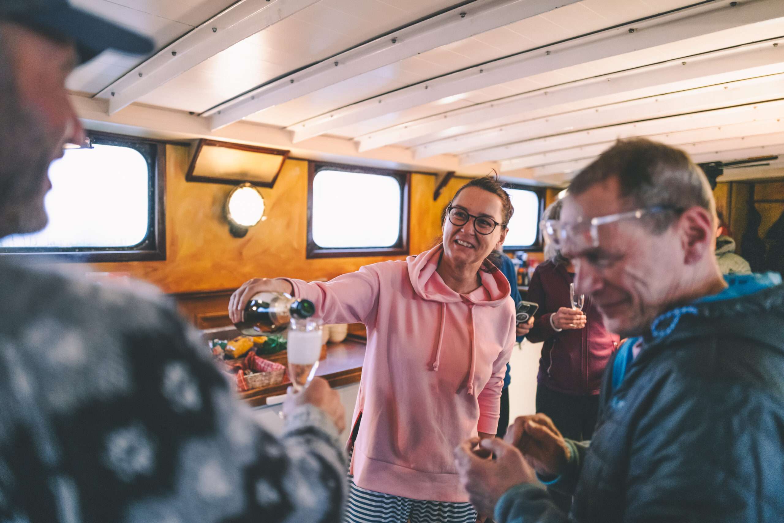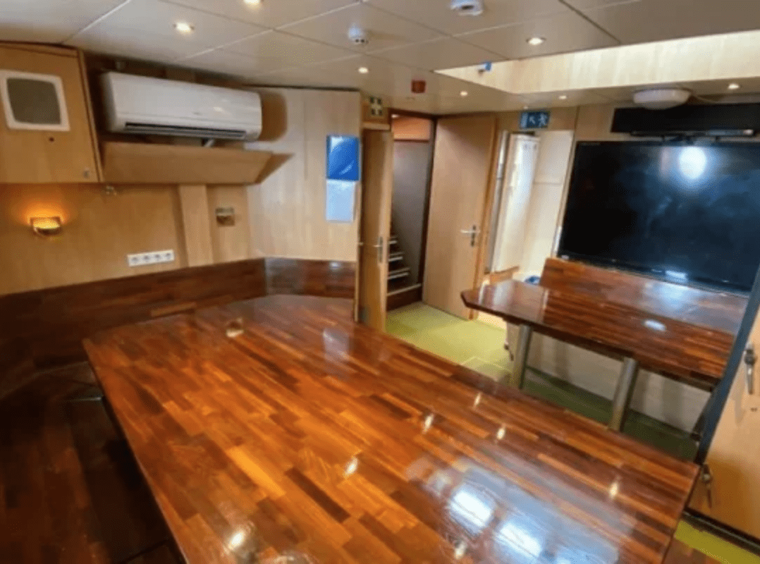 The interior is warm, functional, and inviting. A generous dining salon serves as the heart of the ship, where our onboard chef prepares satisfying, nourishing meals after long days outside. For those who want to stay warm while still taking in the scenery, the heated pilothouse offers panoramic views in total comfort — a cozy retreat when polar weather rolls in.